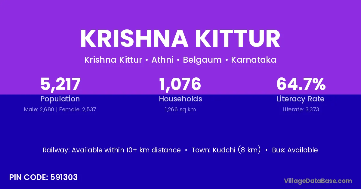 Krishna Kittur village has a total population of 5,217 people, of which 2,680 are males and 2,537 are females.