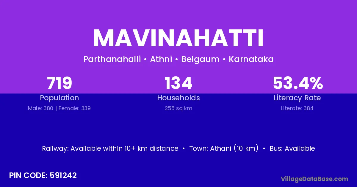 Athani (10 km) is the nearest town to Mavinahatti village for major economic activities and is located approximately 10 km away.