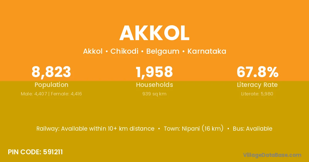 Nipani (16 km) is the nearest town to Akkol village for major economic activities and is located approximately 16 km away.