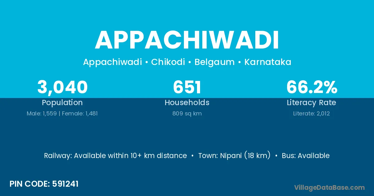 Nipani (18 km) is the nearest town to Appachiwadi village for major economic activities and is located approximately 18 km away.