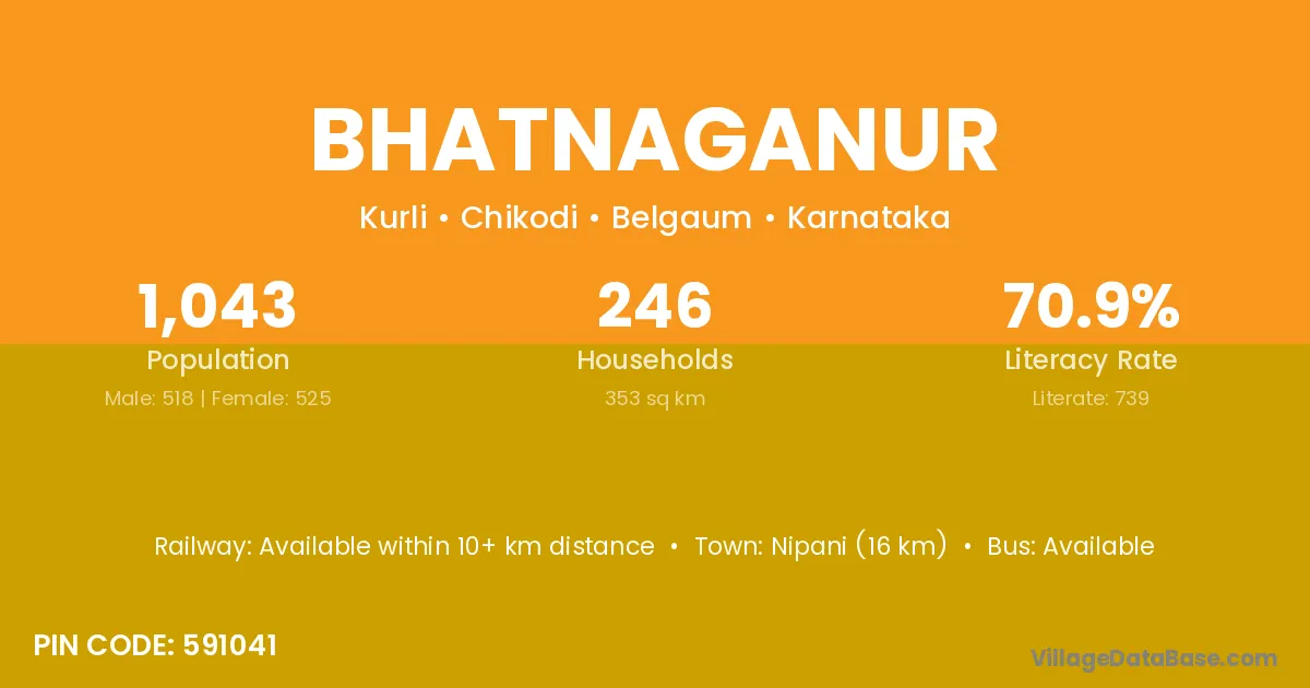 Nipani (16 km) is the nearest town to Bhatnaganur village for major economic activities and is located approximately 16 km away.