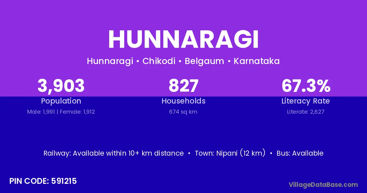 Nipani (12 km) is the nearest town to Hunnaragi village for major economic activities and is located approximately 12 km away.