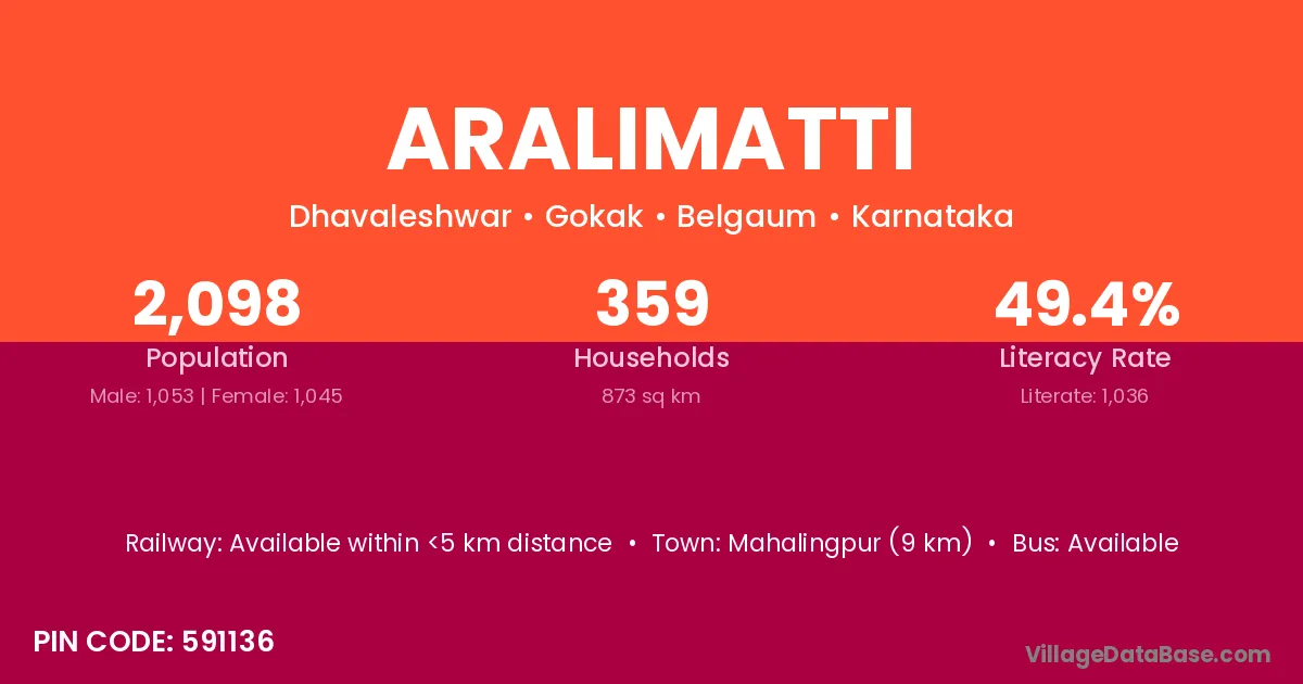Aralimatti village has a total population of 2,098 people, of which 1,053 are males and 1,045 are females.