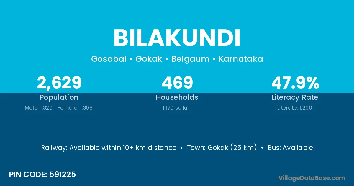 Gokak (25 km) is the nearest town to Bilakundi village for major economic activities and is located approximately 25 km away.