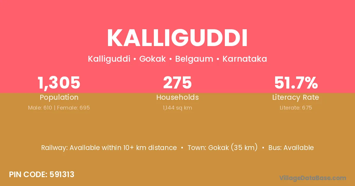 Kalliguddi village has a total population of 1,305 people, of which 610 are males and 695 are females.