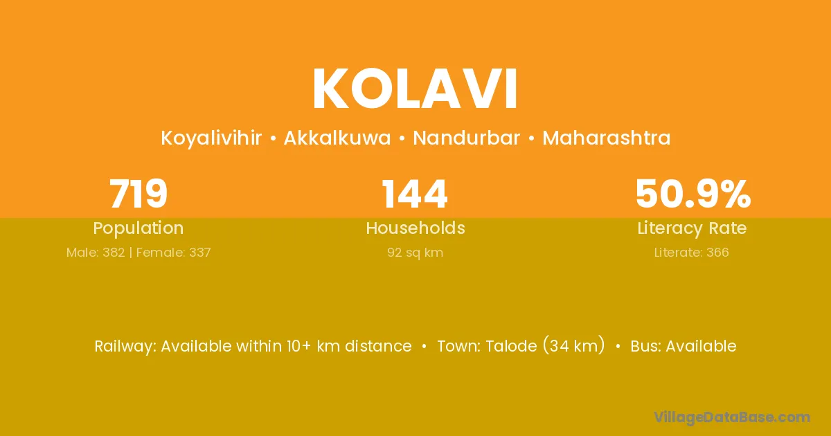 The literacy rate of Kolavi village is 57.80%. Male literacy stands at 67.41% and female literacy at 47.48%.