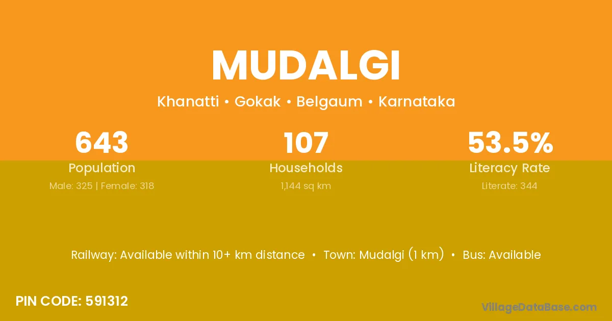 Mudalgi village has a total population of 643 people, of which 325 are males and 318 are females.