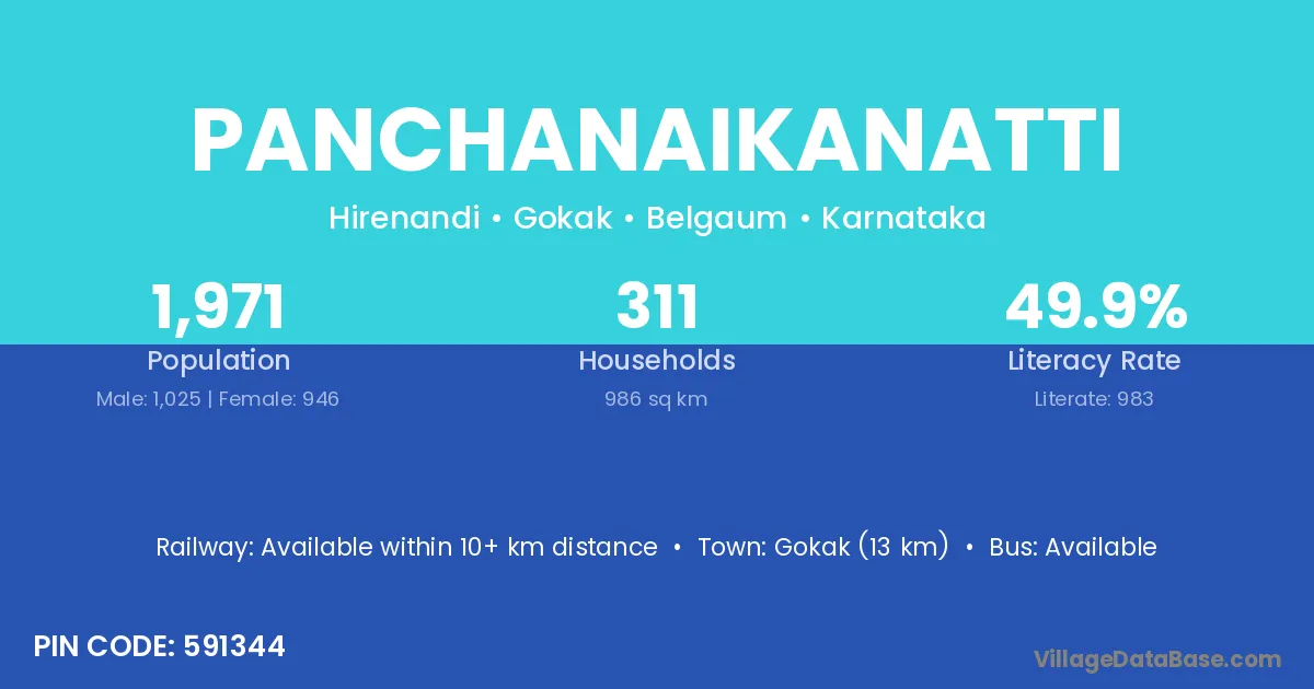 Gokak (13 km) is the nearest town to Panchanaikanatti village for major economic activities and is located approximately 13 km away.