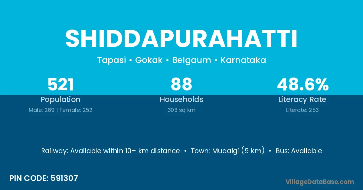 Mudalgi (9 km) is the nearest town to Shiddapurahatti village for major economic activities and is located approximately 9 km away.