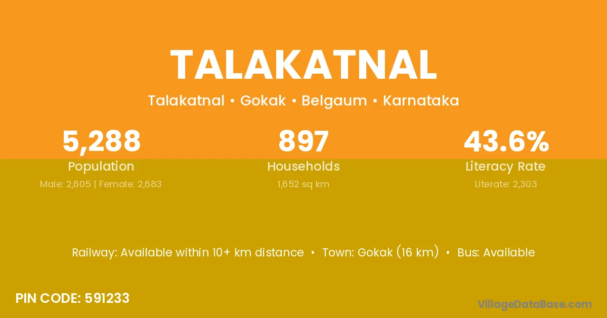 Gokak (16 km) is the nearest town to Talakatnal village for major economic activities and is located approximately 16 km away.