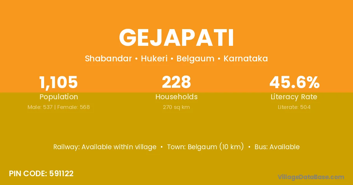 Belgaum (10 km) is the nearest town to Gejapati village for major economic activities and is located approximately 10 km away.