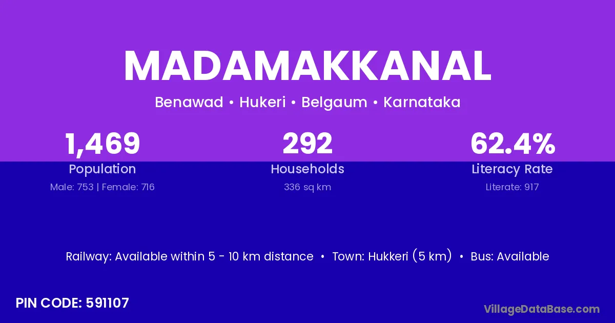 Hukkeri (5 km) is the nearest town to Madamakkanal village for major economic activities and is located approximately 5 km away.