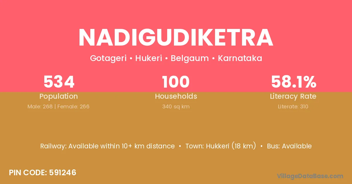 Hukkeri (18 km) is the nearest town to Nadigudiketra village for major economic activities and is located approximately 18 km away.
