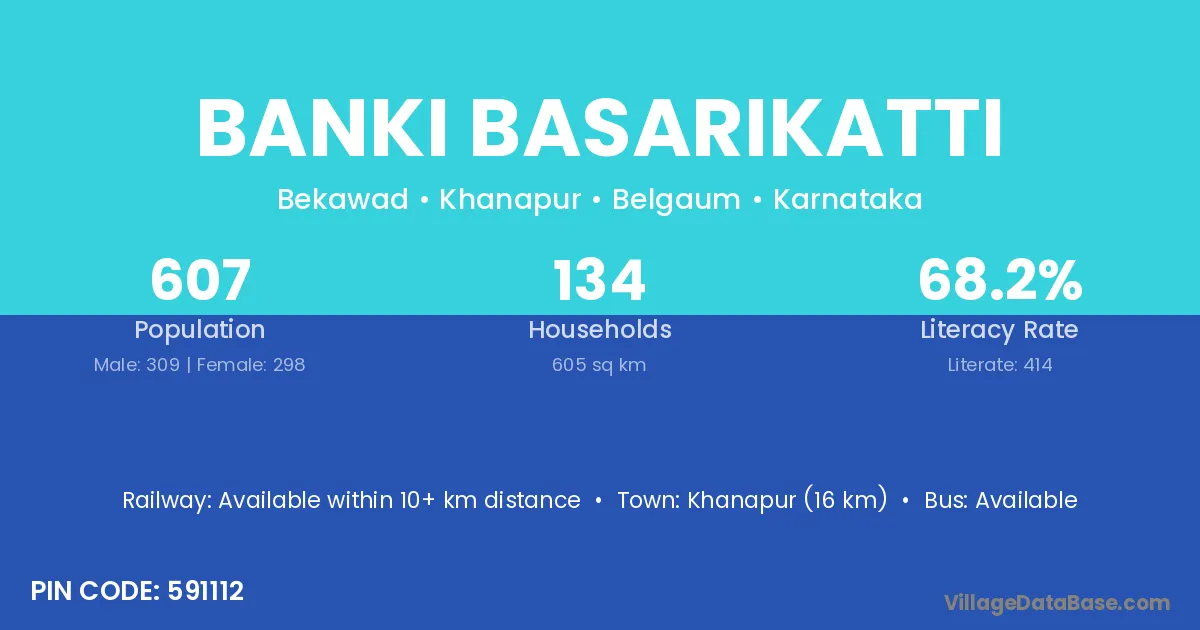 Banki Basarikatti village has a total population of 607 people, of which 309 are males and 298 are females.
