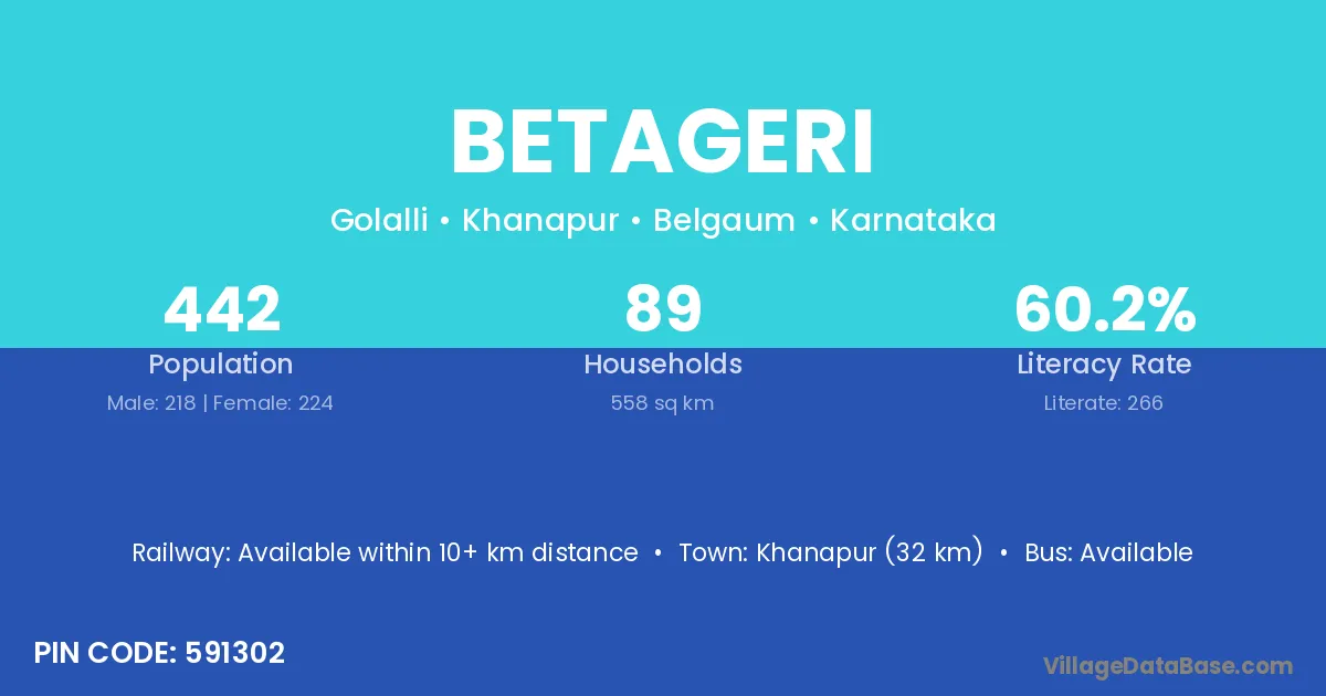 Khanapur (32 km) is the nearest town to Betageri village for major economic activities and is located approximately 32 km away.