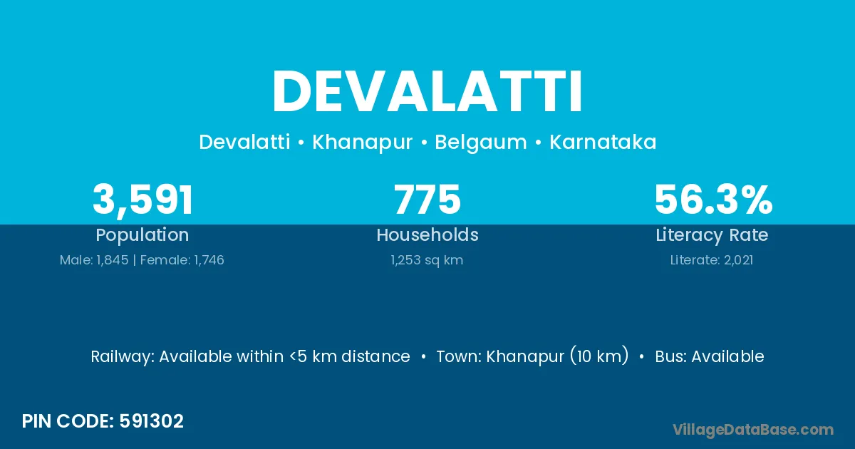 Devalatti village has a total population of 3,591 people, of which 1,845 are males and 1,746 are females.
