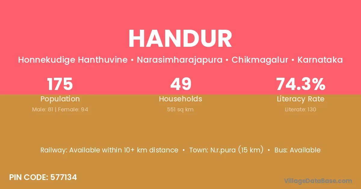 The literacy rate of Handur village is 64.80%. Male literacy stands at 68.37% and female literacy at 61.03%.