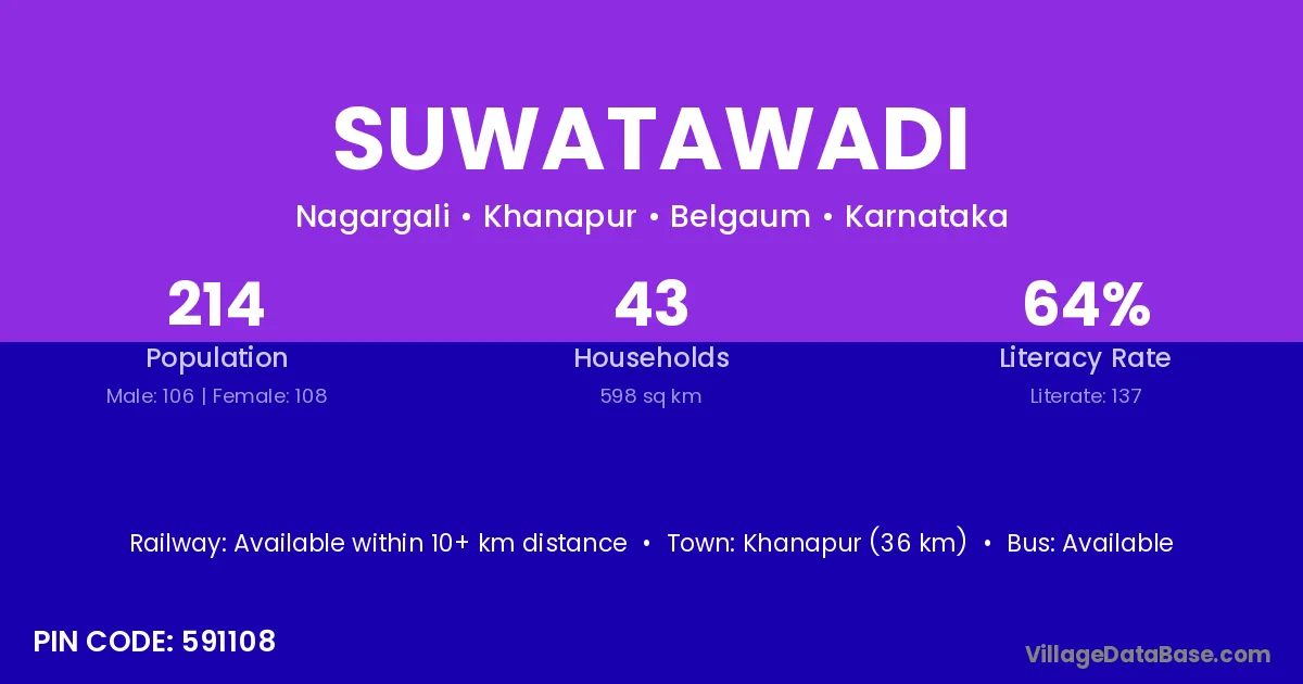 Suwatawadi village has a total population of 214 people, of which 106 are males and 108 are females.