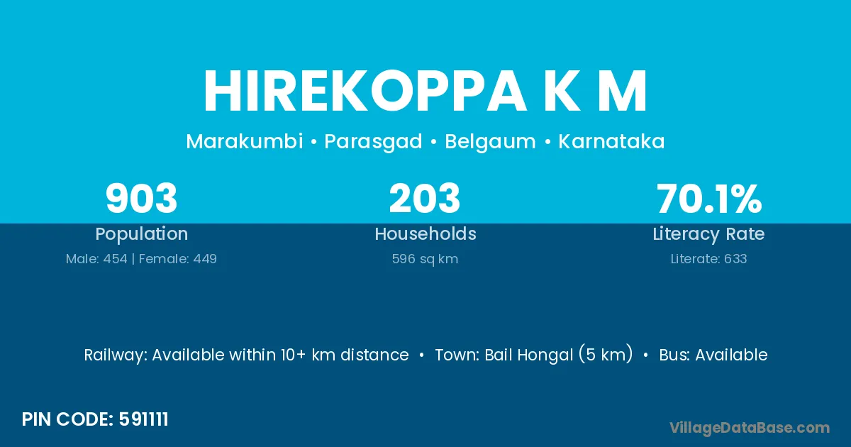 Bail Hongal (5 km) is the nearest town to Hirekoppa K M village for major economic activities and is located approximately 5 km away.
