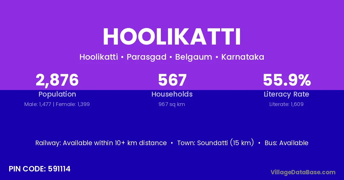 Hoolikatti village has a total population of 2,876 people, of which 1,477 are males and 1,399 are females.