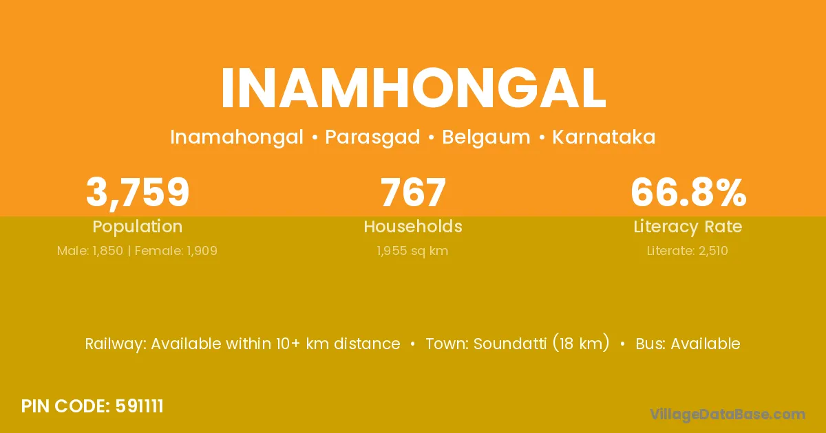 Soundatti (18 km) is the nearest town to Inamhongal village for major economic activities and is located approximately 18 km away.