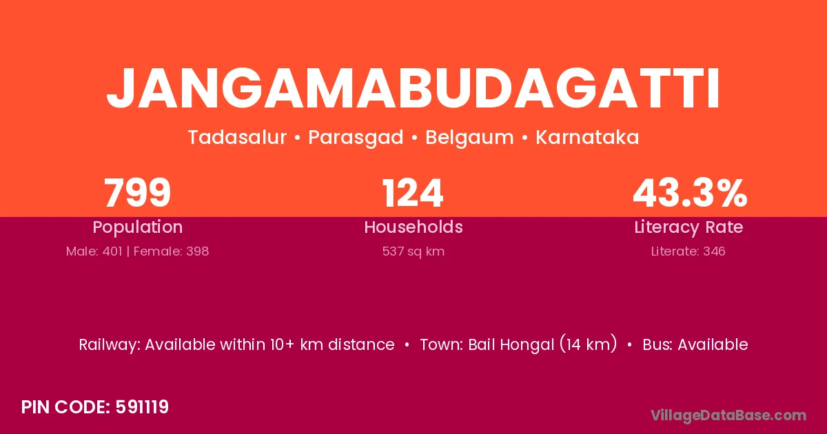Jangamabudagatti village has a total population of 799 people, of which 401 are males and 398 are females.