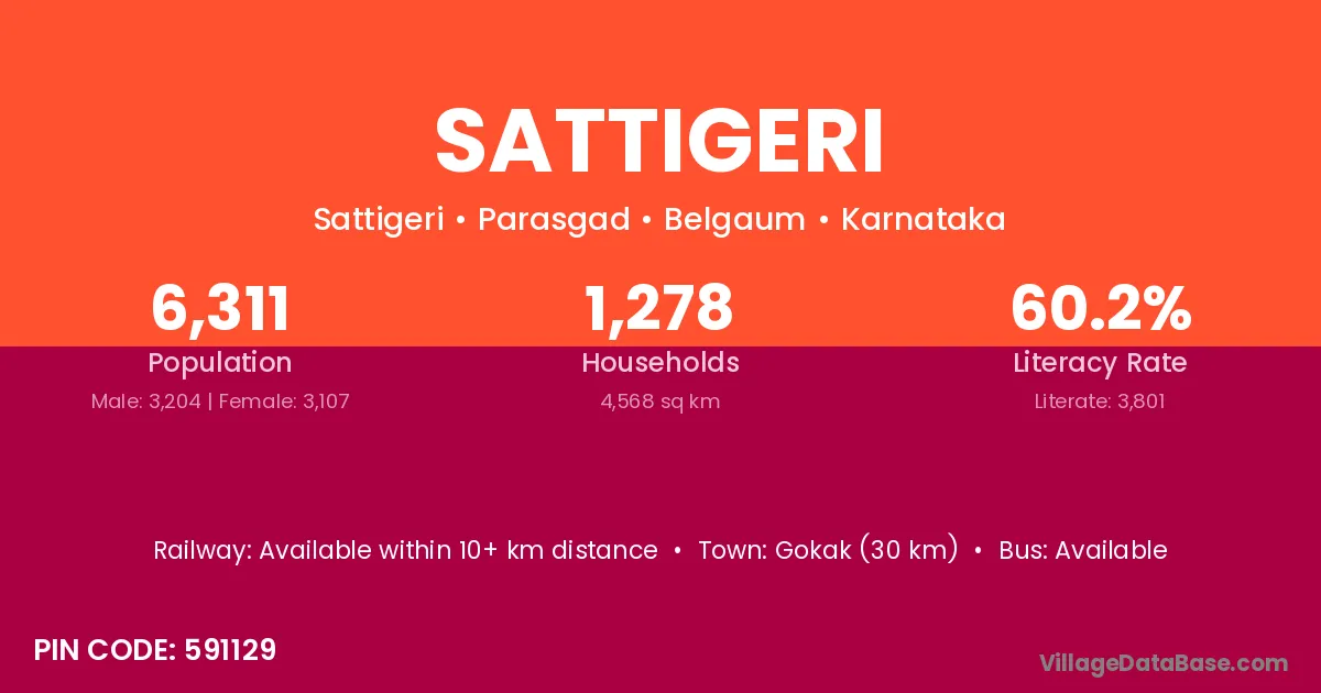 Sattigeri village has a total population of 6,311 people, of which 3,204 are males and 3,107 are females.
