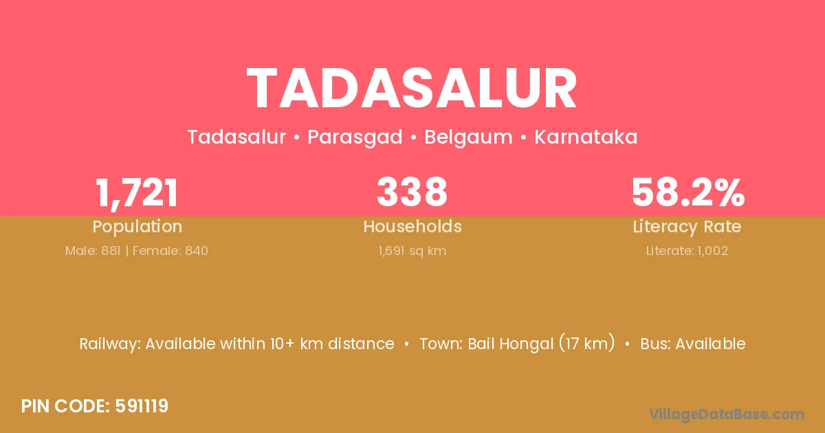 Bail Hongal (17 km) is the nearest town to Tadasalur village for major economic activities and is located approximately 17 km away.