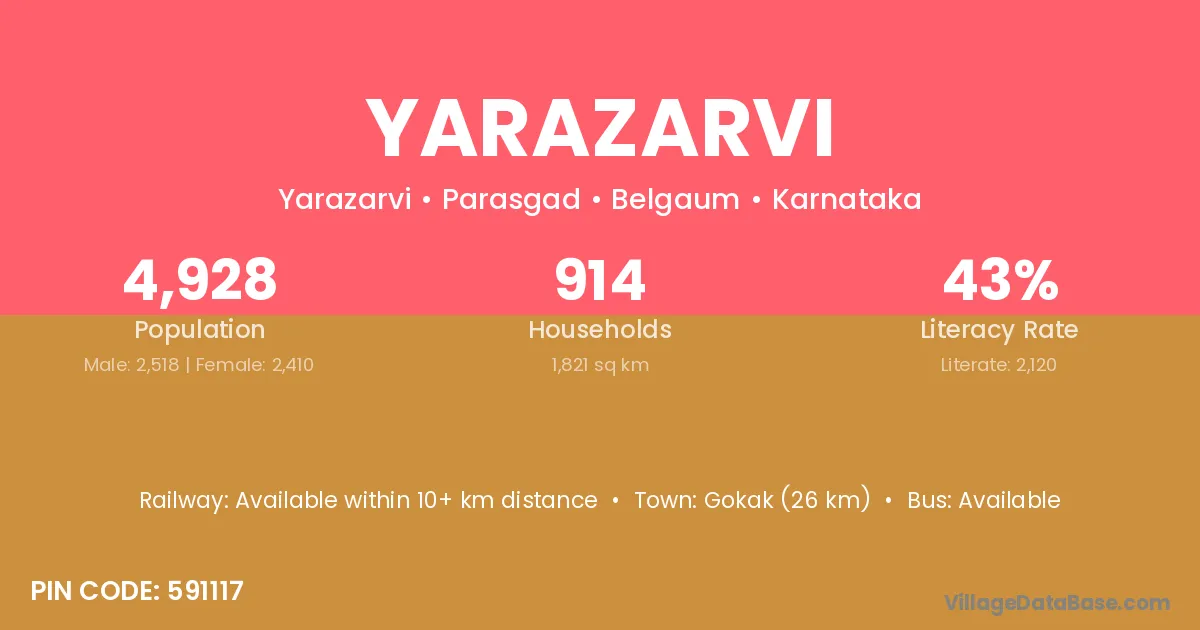 Gokak (26 km) is the nearest town to Yarazarvi village for major economic activities and is located approximately 26 km away.