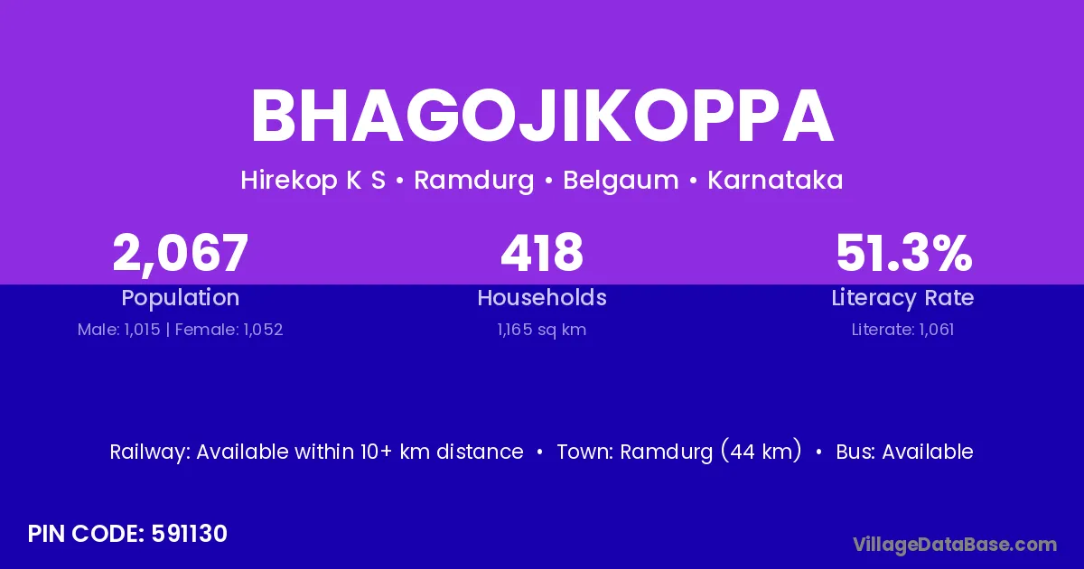 Ramdurg (44 km) is the nearest town to Bhagojikoppa village for major economic activities and is located approximately 44 km away.