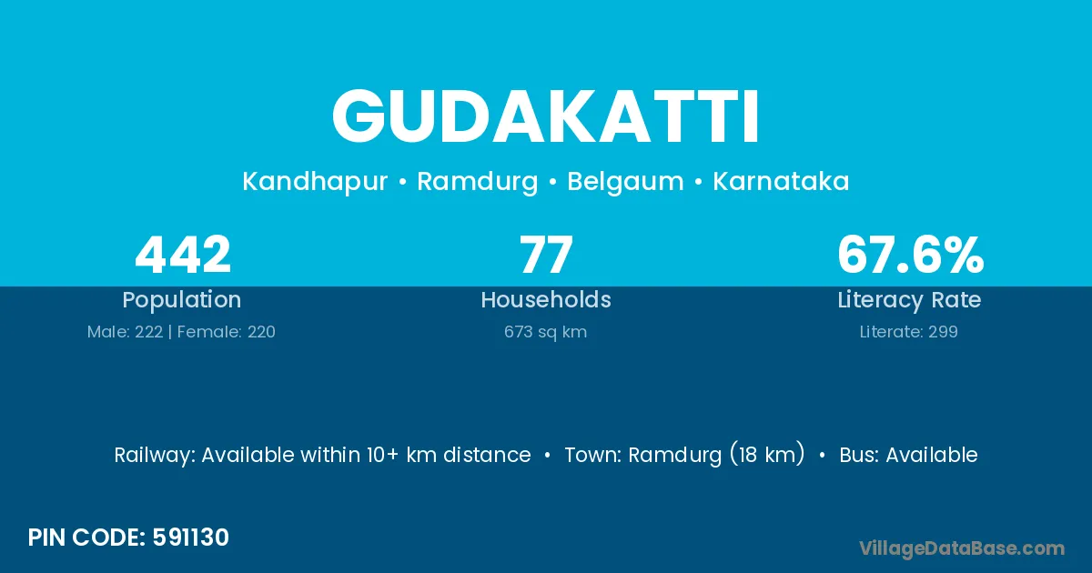 Ramdurg (18 km) is the nearest town to Gudakatti village for major economic activities and is located approximately 18 km away.