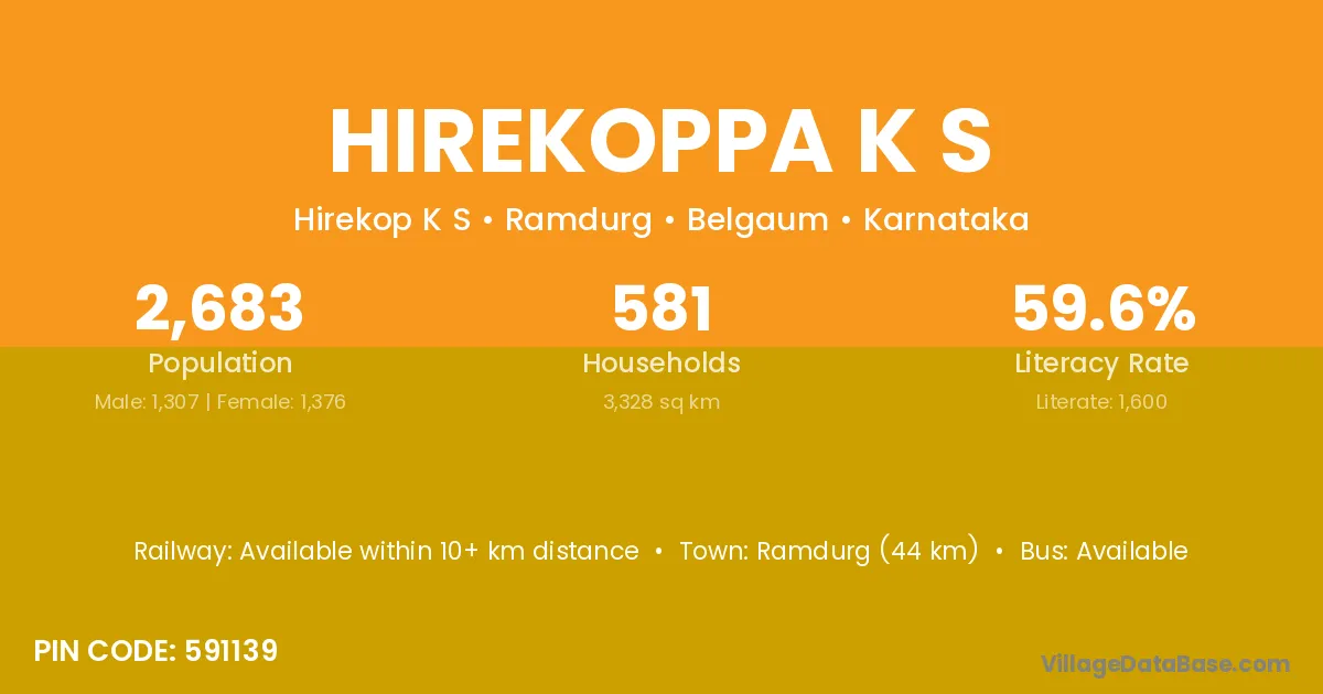 Ramdurg (44 km) is the nearest town to Hirekoppa K S village for major economic activities and is located approximately 44 km away.