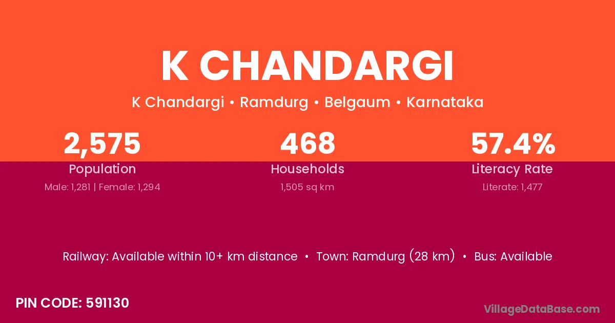 Ramdurg (28 km) is the nearest town to K Chandargi village for major economic activities and is located approximately 28 km away.