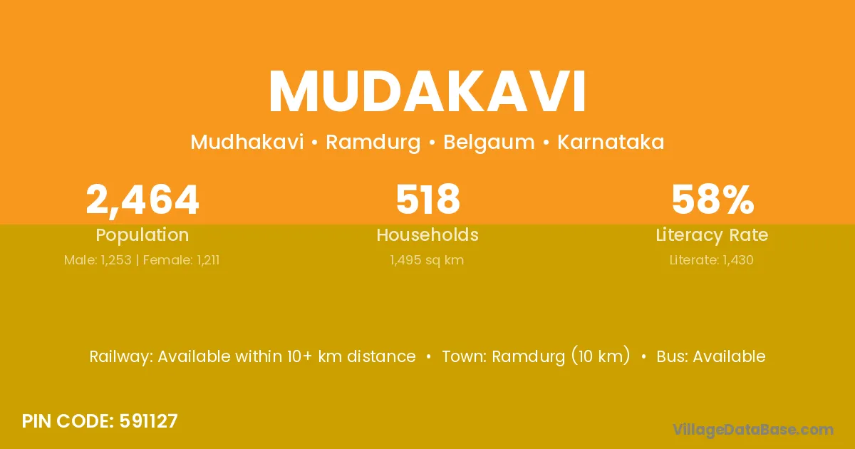 Ramdurg (10 km) is the nearest town to Mudakavi village for major economic activities and is located approximately 10 km away.