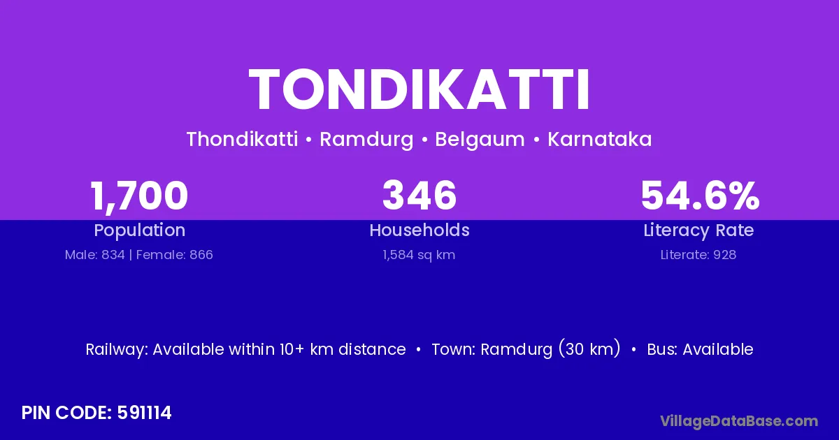 Ramdurg (30 km) is the nearest town to Tondikatti village for major economic activities and is located approximately 30 km away.