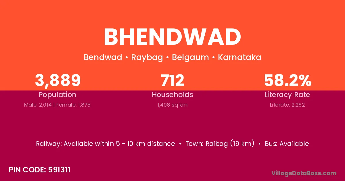 Raibag (19 km) is the nearest town to Bhendwad village for major economic activities and is located approximately 19 km away.