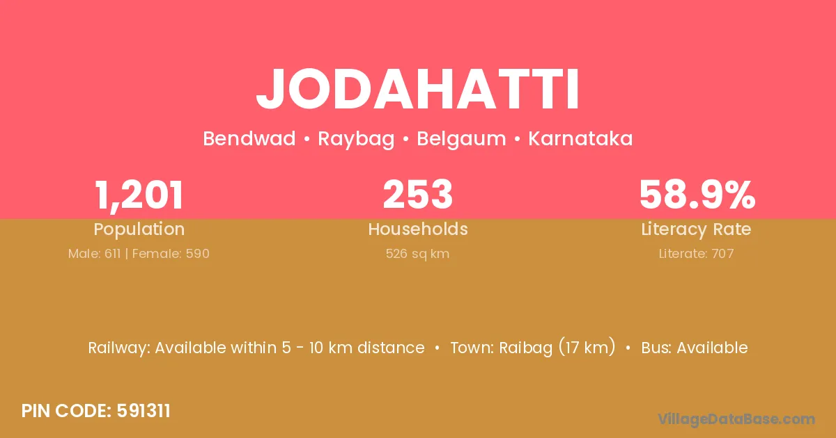 Jodahatti village has a total population of 1,201 people, of which 611 are males and 590 are females.