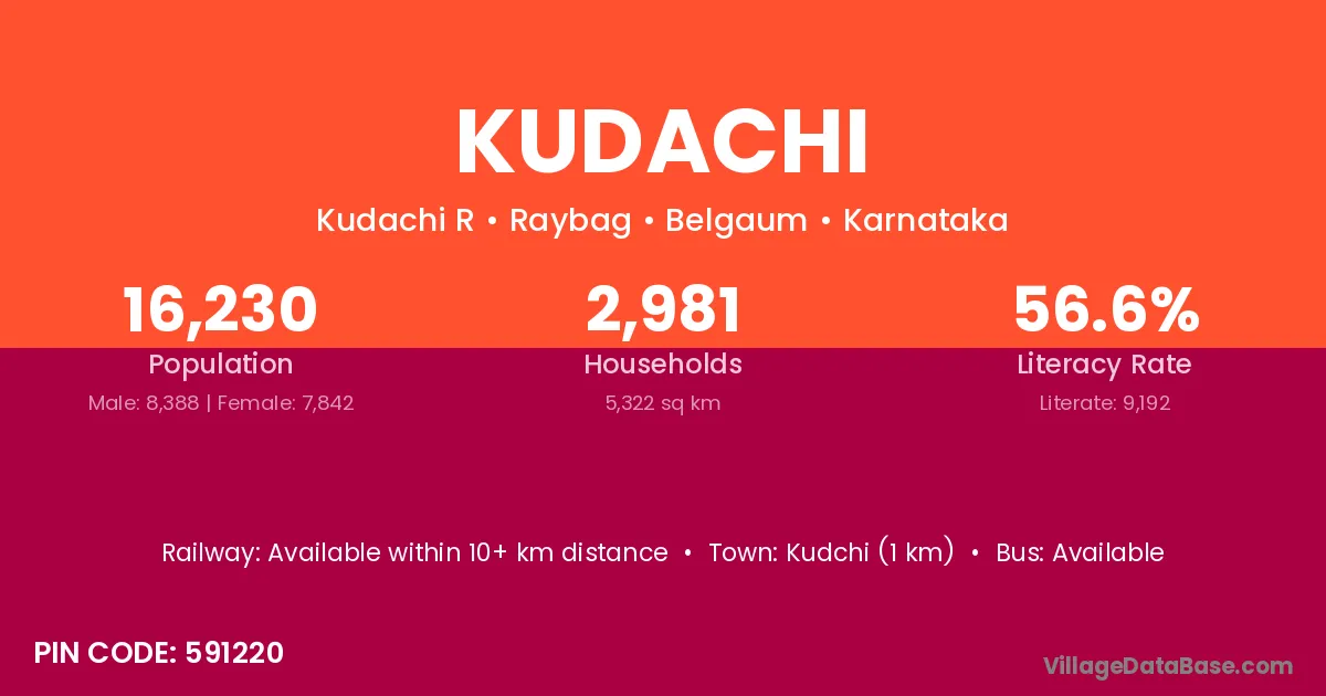 Kudachi village has a total population of 16,230 people, of which 8,388 are males and 7,842 are females.