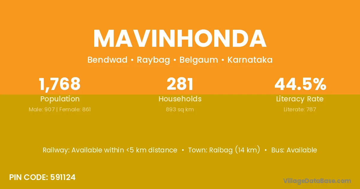 Raibag (14 km) is the nearest town to Mavinhonda village for major economic activities and is located approximately 14 km away.