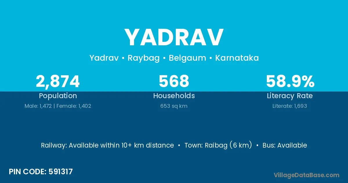 Raibag (6 km) is the nearest town to Yadrav village for major economic activities and is located approximately 6 km away.