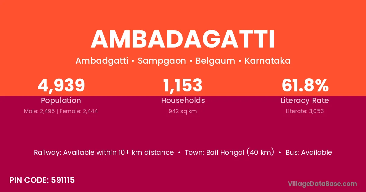 Ambadagatti village has a total population of 4,939 people, of which 2,495 are males and 2,444 are females.