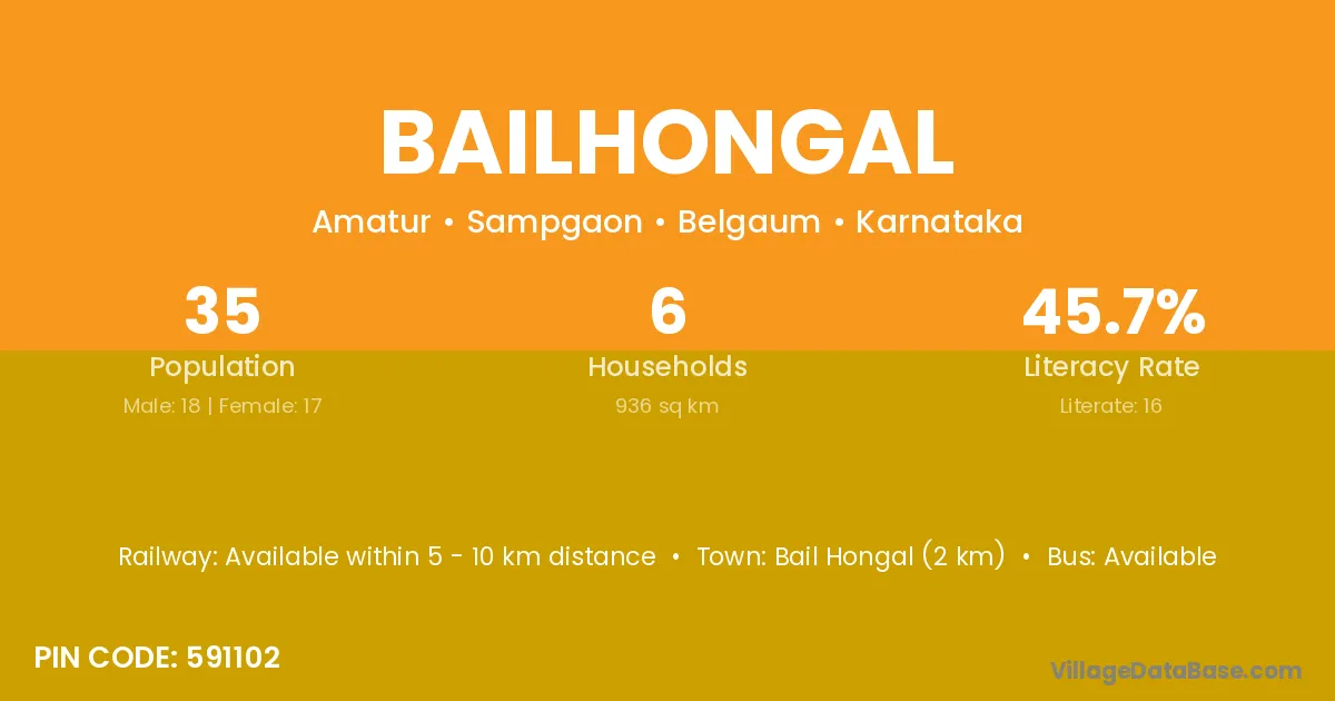 Bailhongal village has a total population of 35 people, of which 18 are males and 17 are females.