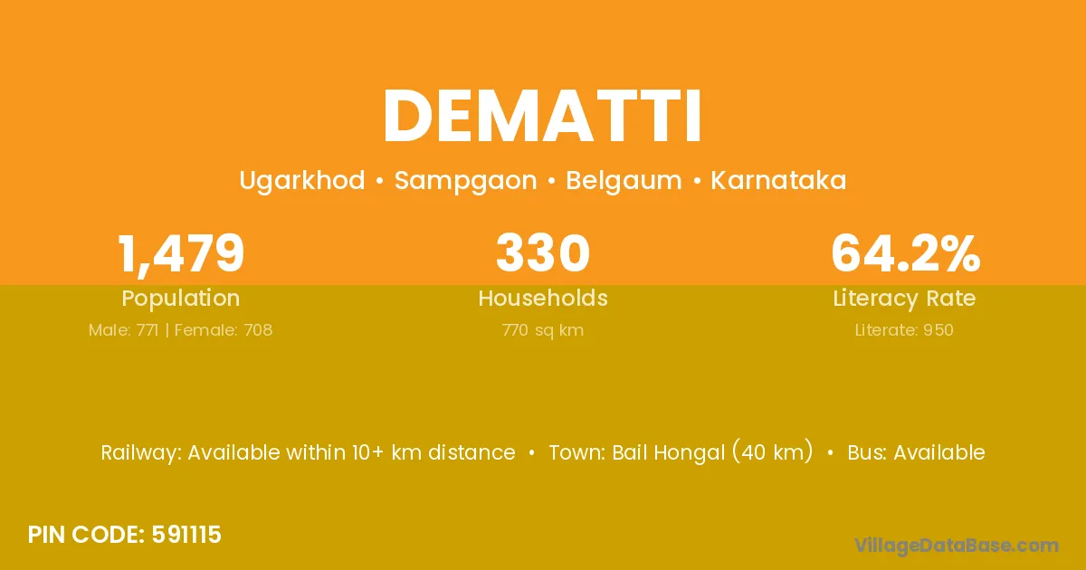 Bail Hongal (40 km) is the nearest town to Dematti village for major economic activities and is located approximately 40 km away.