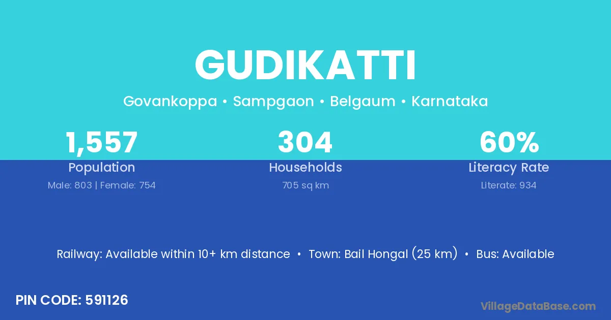 Bail Hongal (25 km) is the nearest town to Gudikatti village for major economic activities and is located approximately 25 km away.