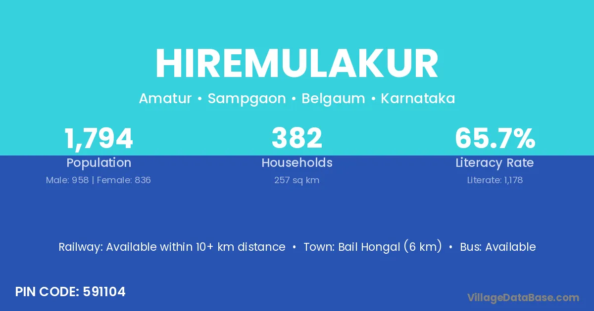 Bail Hongal (6 km) is the nearest town to Hiremulakur village for major economic activities and is located approximately 6 km away.