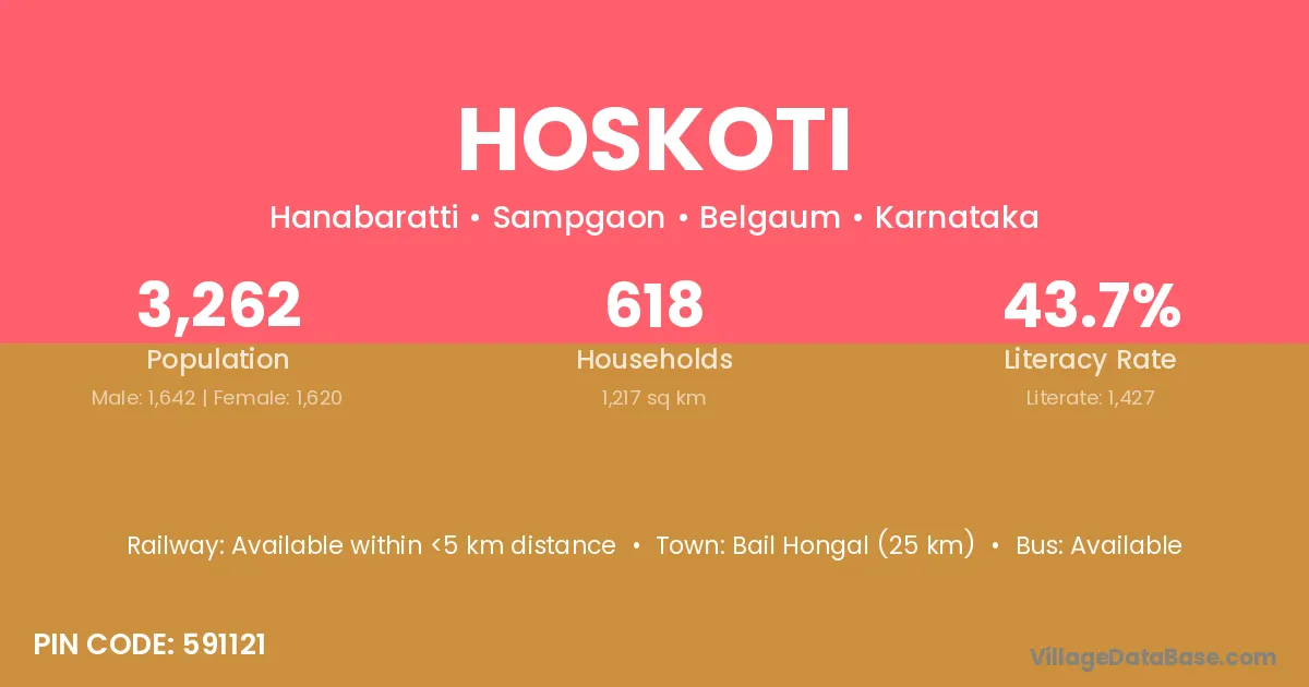 Bail Hongal (25 km) is the nearest town to Hoskoti village for major economic activities and is located approximately 25 km away.