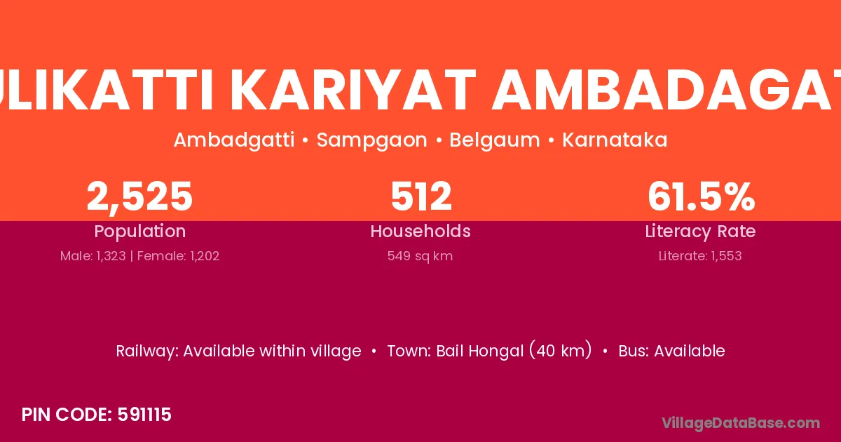 Hulikatti Kariyat Ambadagatti village has a total population of 2,525 people, of which 1,323 are males and 1,202 are females.