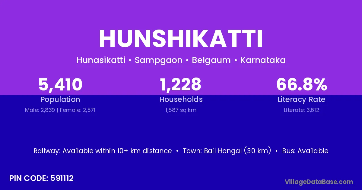 Bail Hongal (30 km) is the nearest town to Hunshikatti village for major economic activities and is located approximately 30 km away.