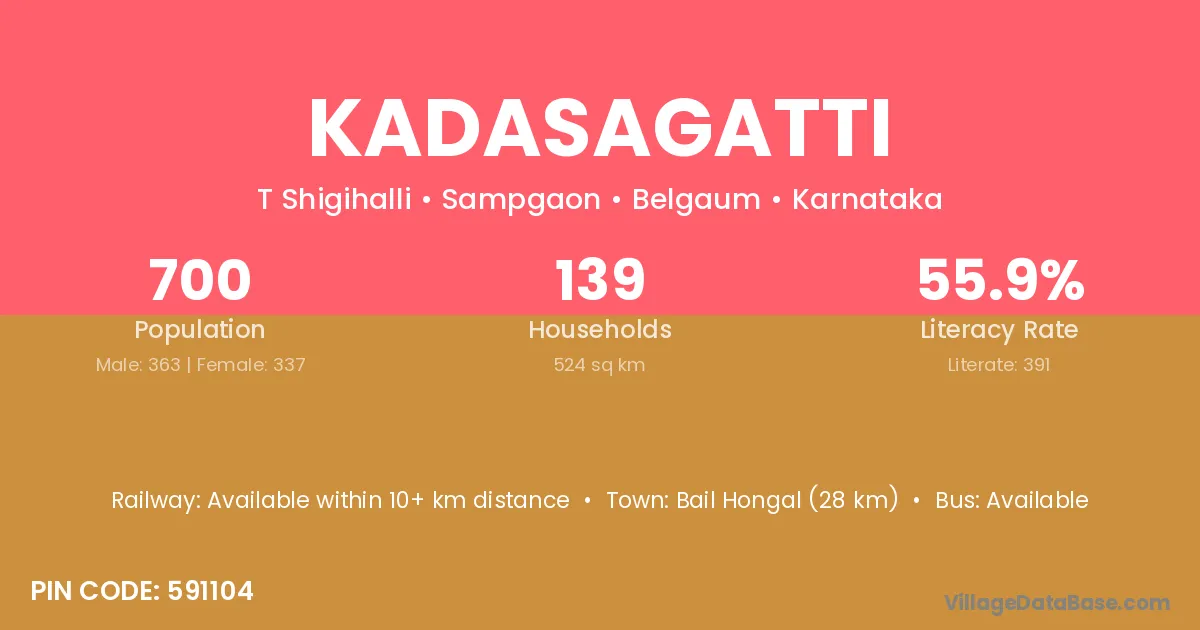 Bail Hongal (28 km) is the nearest town to Kadasagatti village for major economic activities and is located approximately 28 km away.