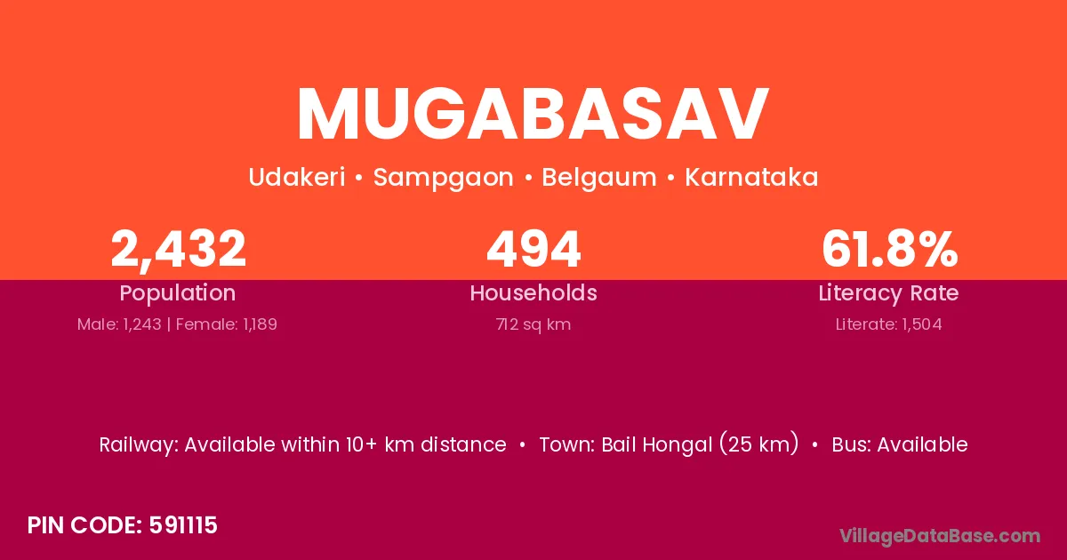 Mugabasav village has a total population of 2,432 people, of which 1,243 are males and 1,189 are females.